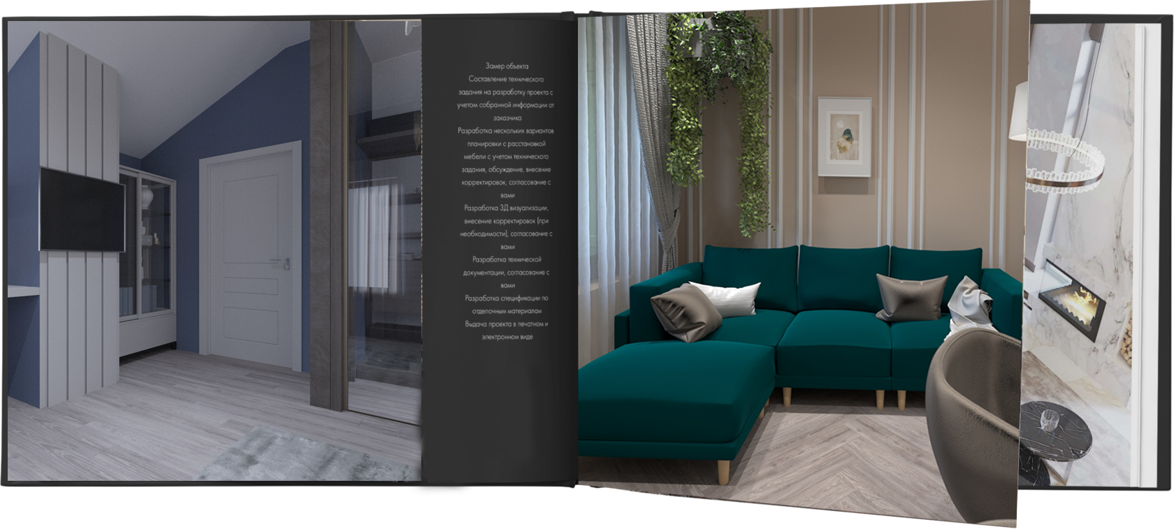 Просчет всех материалов и элементов интерьера, согласование с вами.